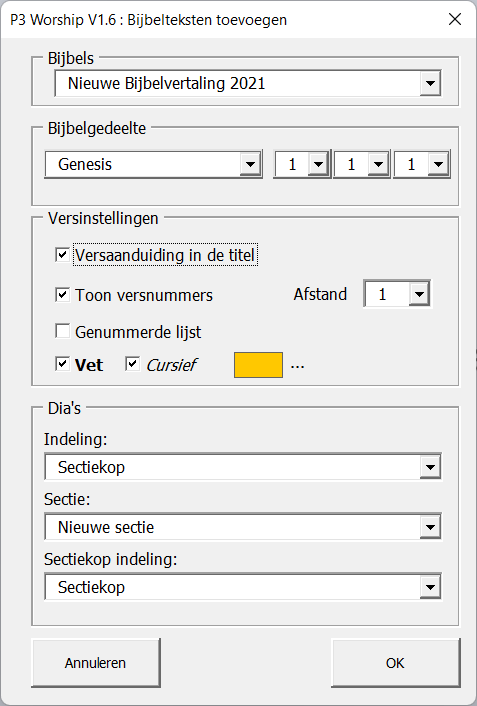 Onder het kopje "Dia's" geef je aan welke indeling je wilt gebruiken en in welke sectie je de bijbeltekst wilt plaatsen. Wanneer je voor "Nieuwe sectie" kiest wordt er een nieuwe sectie in je
