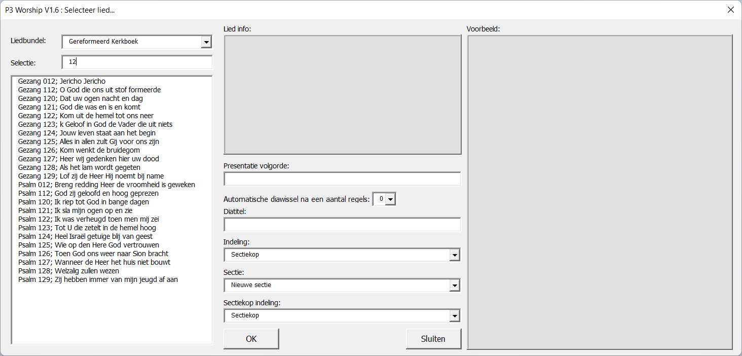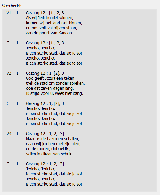 In dit voorbeeld is als diatitel "Gezang 12 : %" opgegeven en een automatische diawissel na 2 regels. Elke sectie is nu over twee dia's verdeeld.