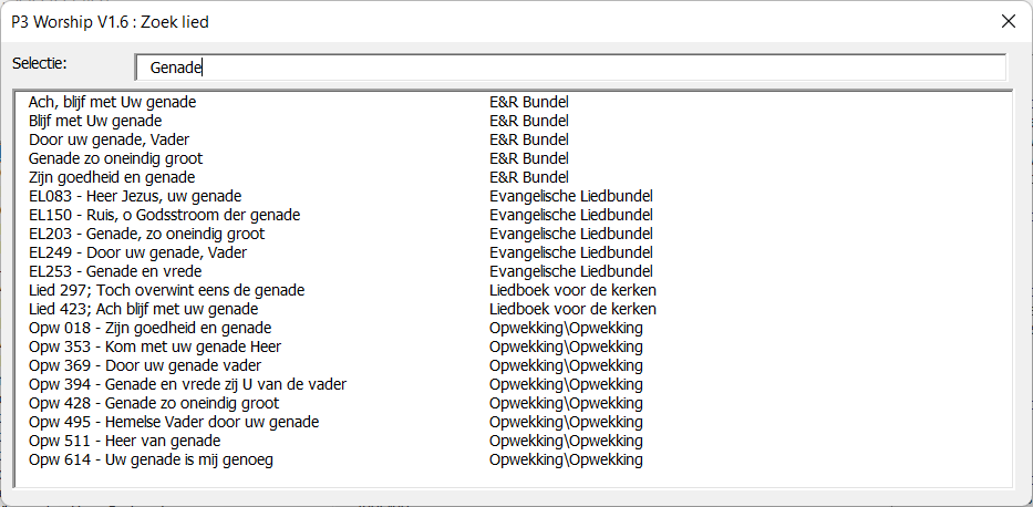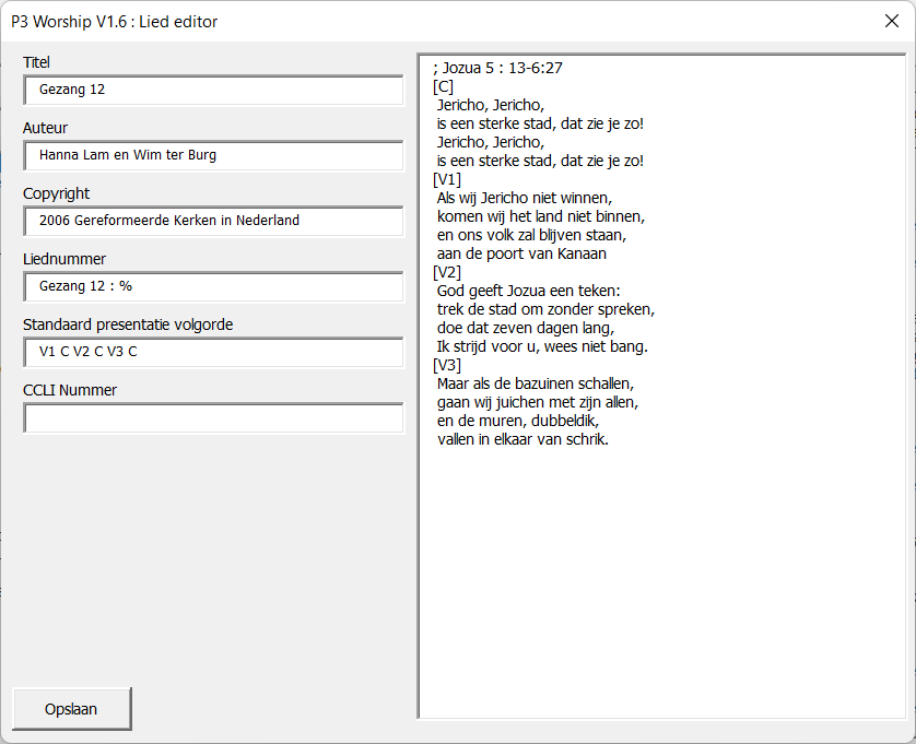 Wanneer je een locatie voor je liedteksten hebt ingesteld, kun je dia's met liedteksten maken. Selecteer uit het P3 Worship menu de optie "Liedtekst". Er verschijnt een scherm dat er als volgt uit kan zien: