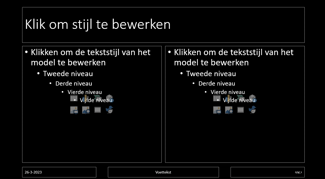 In bovenstaand voorbeeld bevat de indeling een titel, twee tijdelijke aanduidingen (met de tekst "Klik om de modelstijlen te berwerken"), een voettekst en een aanduiding voor datum en dianummer. P3 Worship selecteert de tijdelijke aanduiding van de twee die de hoogste oppervlakte heeft.