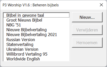 Met de knop "Verwijderen" kun je een bijbel uit P3 Worship verwijderen en om de naam van een bijbel te wijzigen, kun je de knop "Hernoemen" gebruiken.