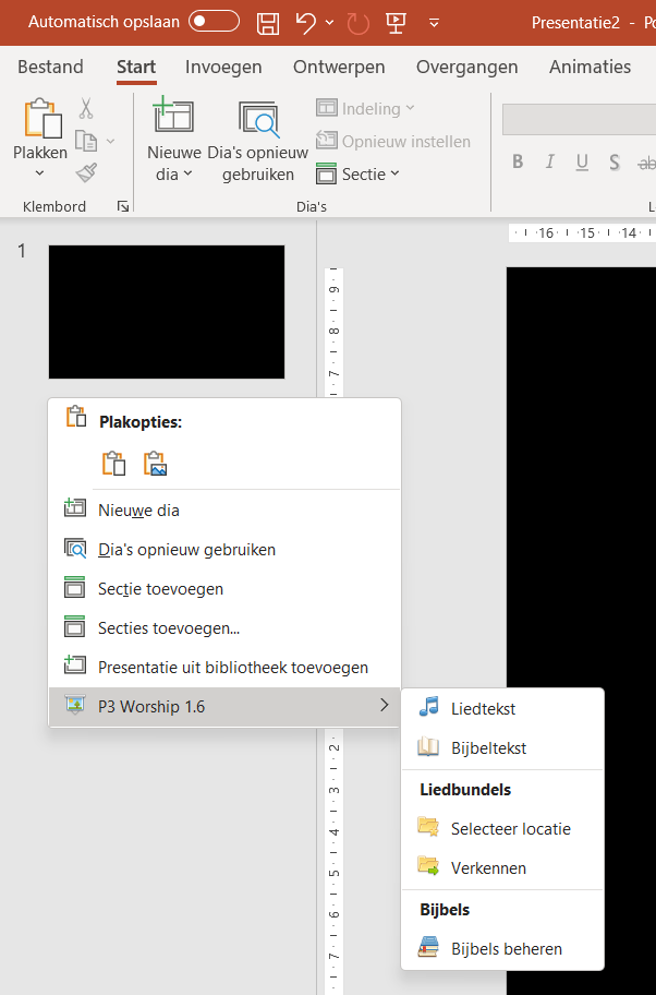 Na installatie zijn de functies van P3 Worship zichtbaar wanneer je een presentatie hebt geopend in de Normale weergave en de Diasorteerder weergave. Klik met de rechter muisknop tussen of ná de dia's in het panel met de overzicht van dia's.